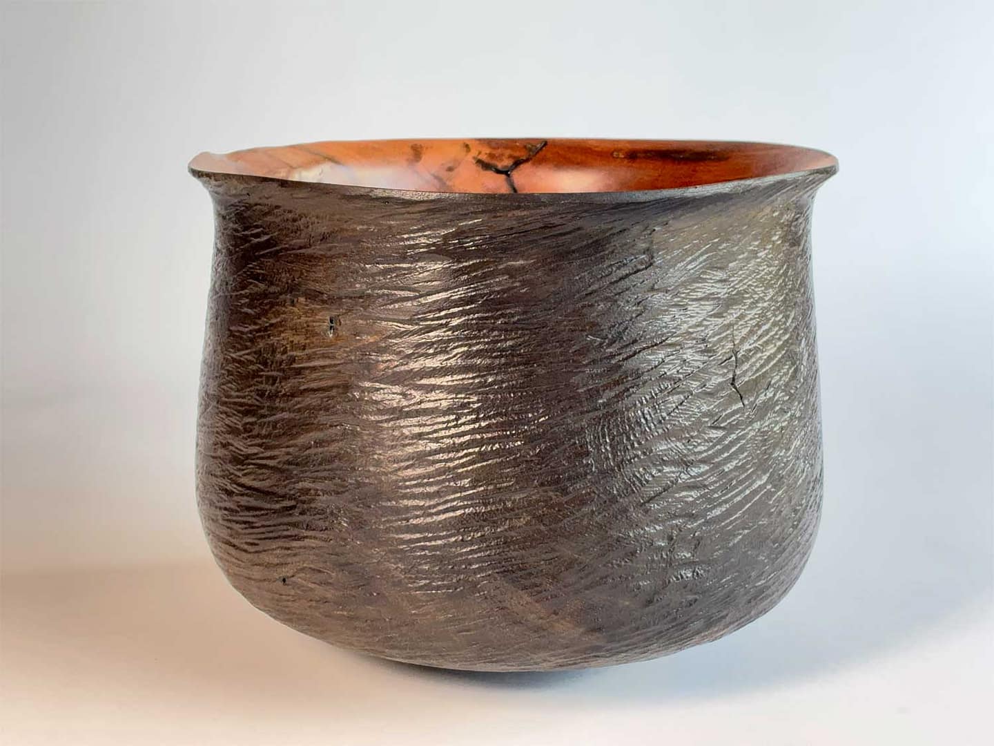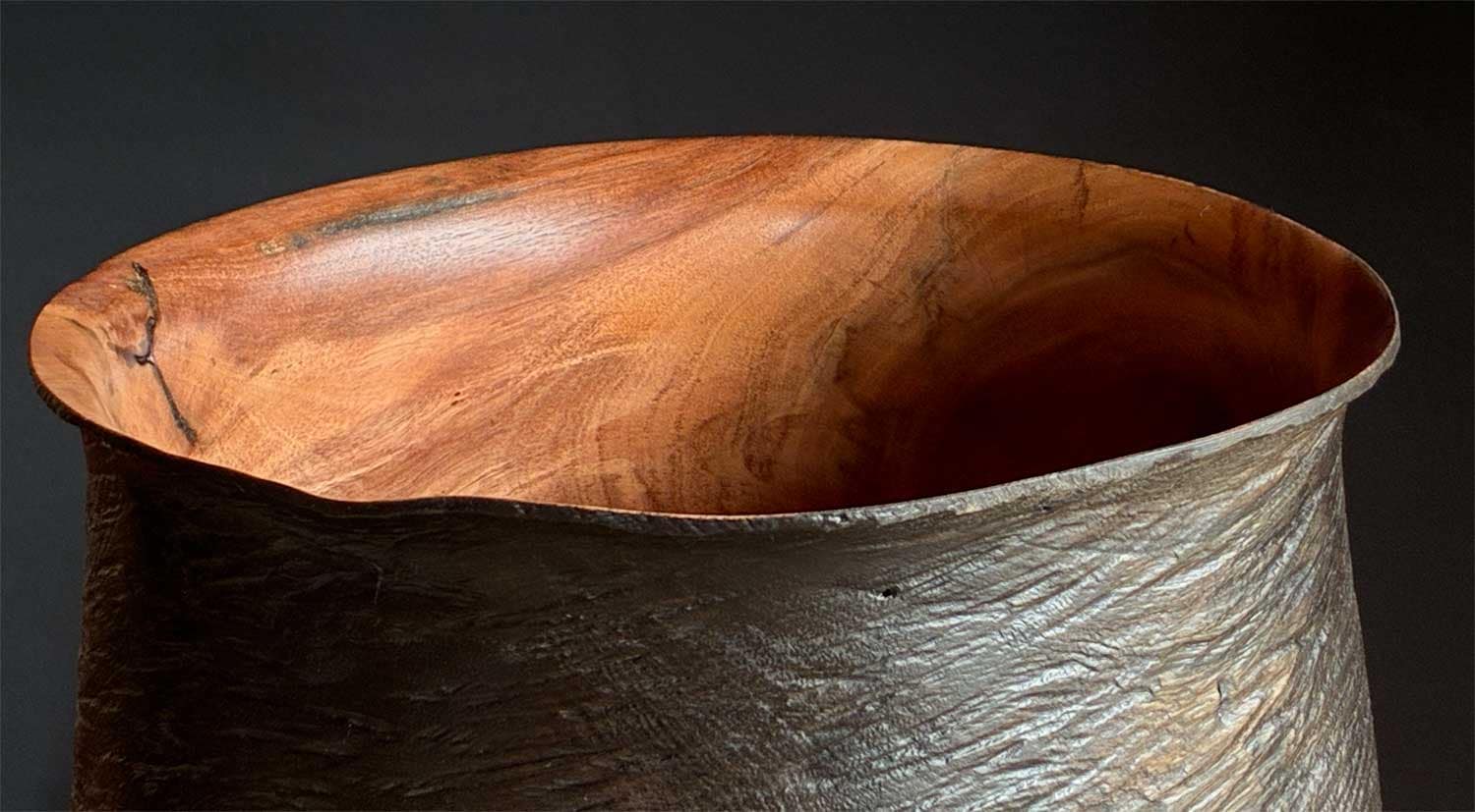 This vessel is carved from pohutukawa, featuring a hand-textured & ebonised exterior that contrasts beautifully with the smooth, natural wood interior. The very thin rim has subtly moved and distorted during drying, creating an organic, flowing lip that enhances its sculptural presence.