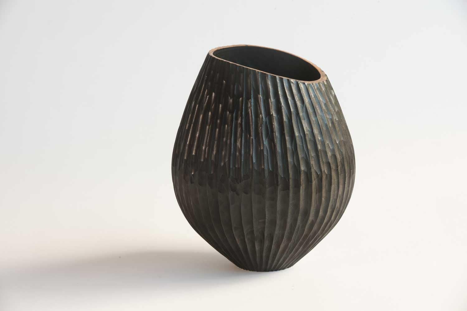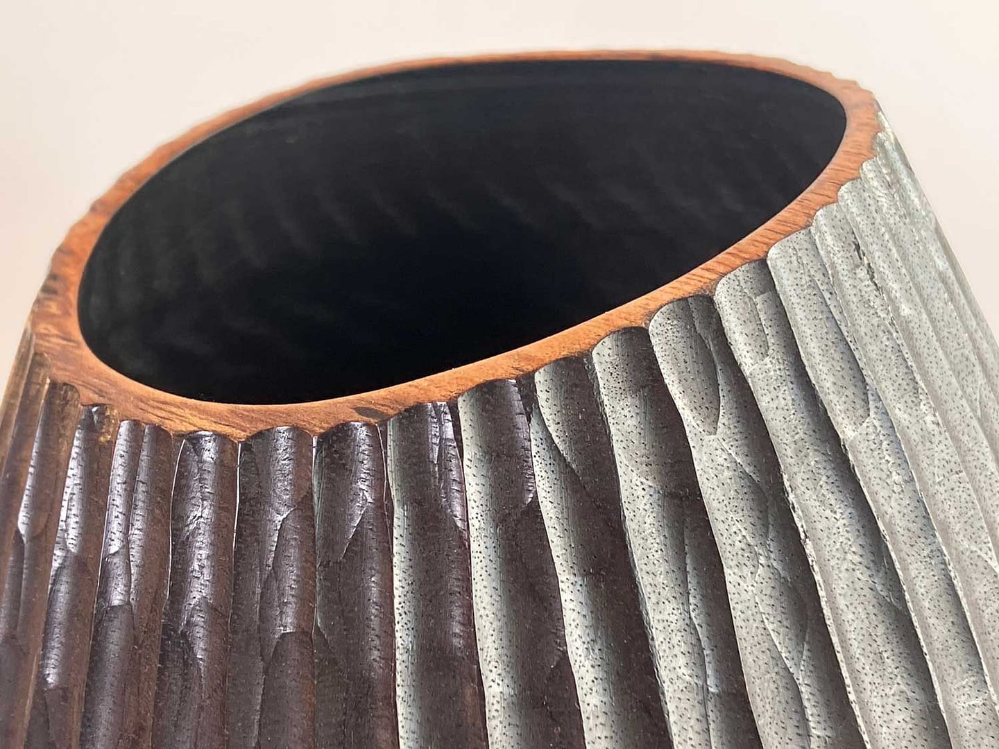 Turned from Taraire wood and then carefully hand-carved, this vessel has a striking contrast between the natural timber rim and the ink blackened body, drawing the eye to its sculptural edge.