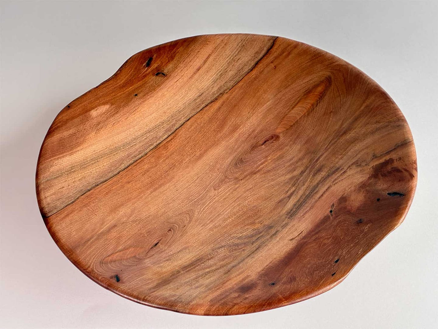This medium-sized pohutukawa platter has a gentle, flowing curve — a form I’m particularly pleased with. The wood itself has a beautiful, subtle ripple created during the drying process, giving the surface a soft, organic texture that catches the light as you move around it.