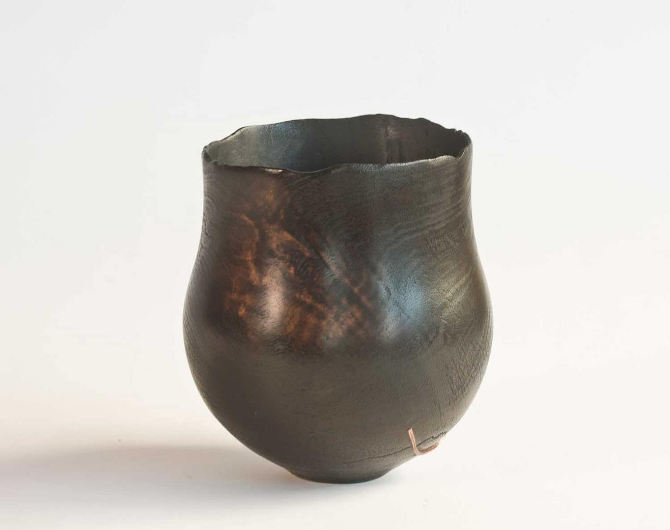 The textured rim adds tactile interest, while areas of natural wood peek through the blackened surface, highlighting the beauty of the taraire. A beaten copper wire repair is incorporated as a deliberate feature, celebrating imperfection and adding a sense of history and resilience to the piece.