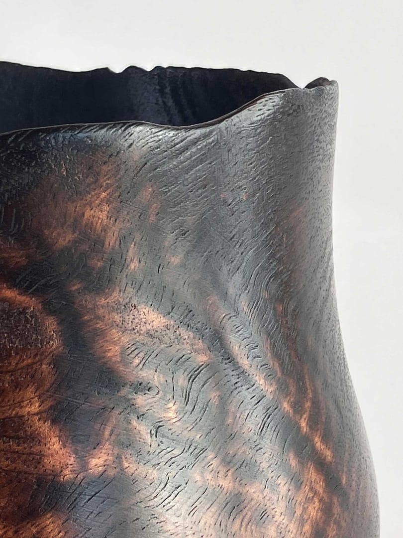 Handcrafted in New Zealand, this contemporary wooden art vessel combines the drama of flame with refined form. It is a bespoke wooden sculpture that balances natural texture, artistry, and enduring craftsmanship.