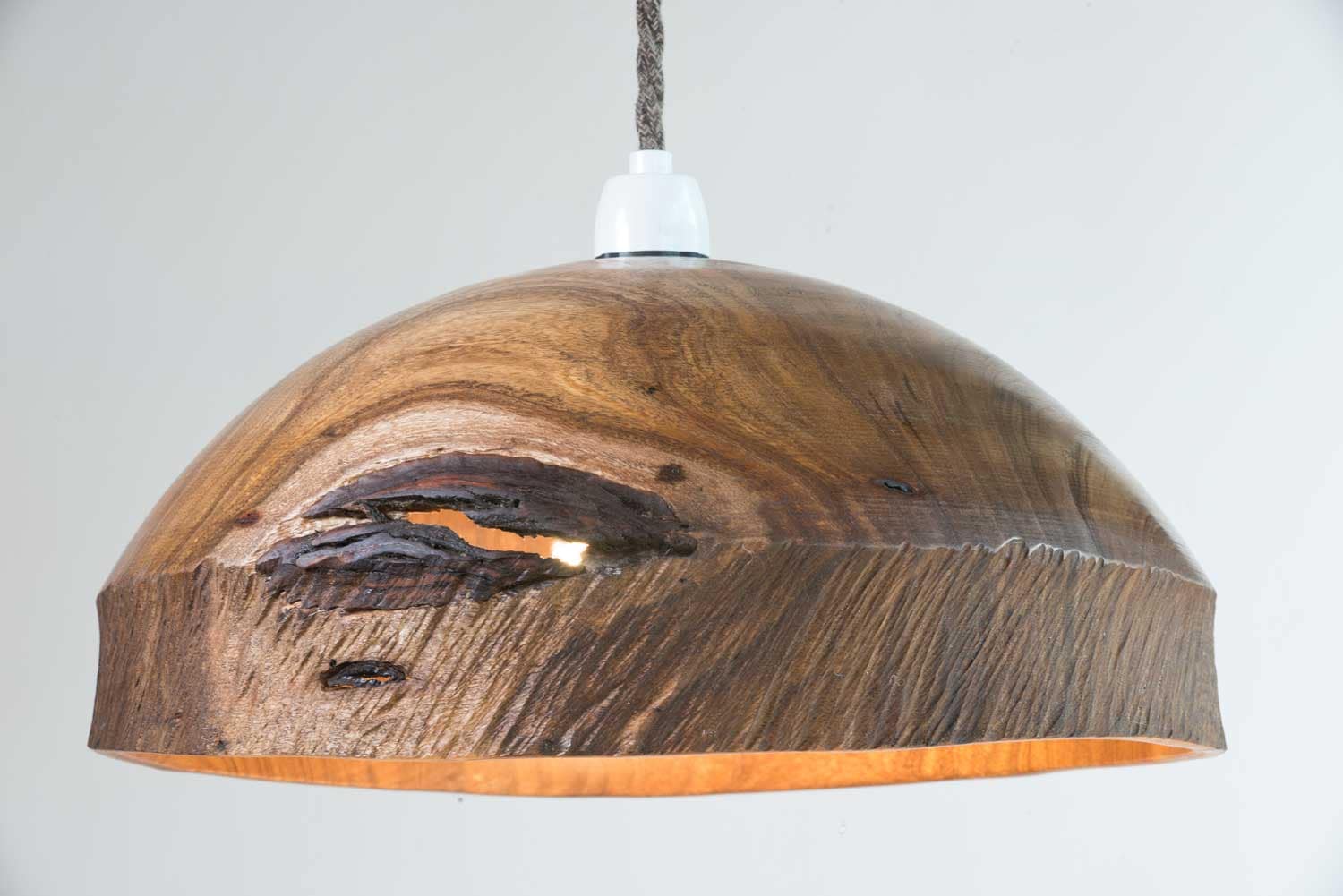 Turned and hand-carved from a single piece of wood, this pendant light shade reveals a richly textured surface and beautifully figured grain. The natural black inclusion acts as a focal point, allowing soft light to escape through the darker area, creating subtle depth and atmosphere.