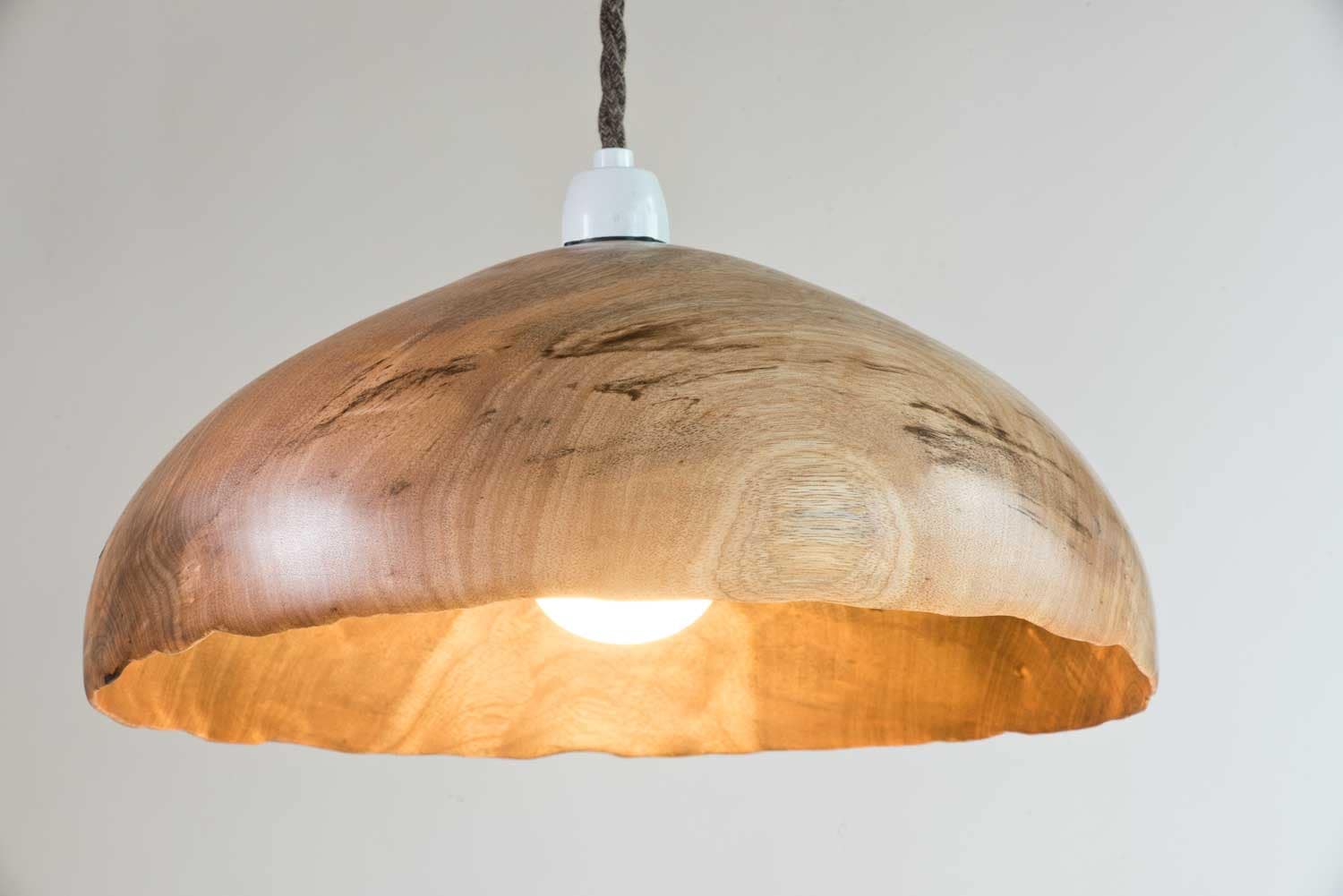 Turned from a single piece of New Zealand Taraire, this pendant light showcases the natural beauty of the wood in its purest form. The subtle grain and striking spalting are highlighted both inside and out, creating a warm, organic glow when illuminated.